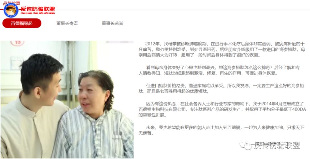 图片来源:百德福官网 据冯卫讲述,2012年,冯卫的母亲被诊断肺癌晚期,到处寻医问药无果后经朋友介绍服用了一款进口的海参短肽,其母亲用后病情大为好转,服用了一段时间后身体得到了很好的恢复。冯卫经了解和专人请教得知,短肽对细胞起到激活、修复、再生的作用,可促进身体恢复。但进口短肽价格昂贵,普通家庭难以承受。为了让天下无疾苦,冯卫于2014年注册成立了百德福生物科技有限公司,专注肽系列产品的研发生产。