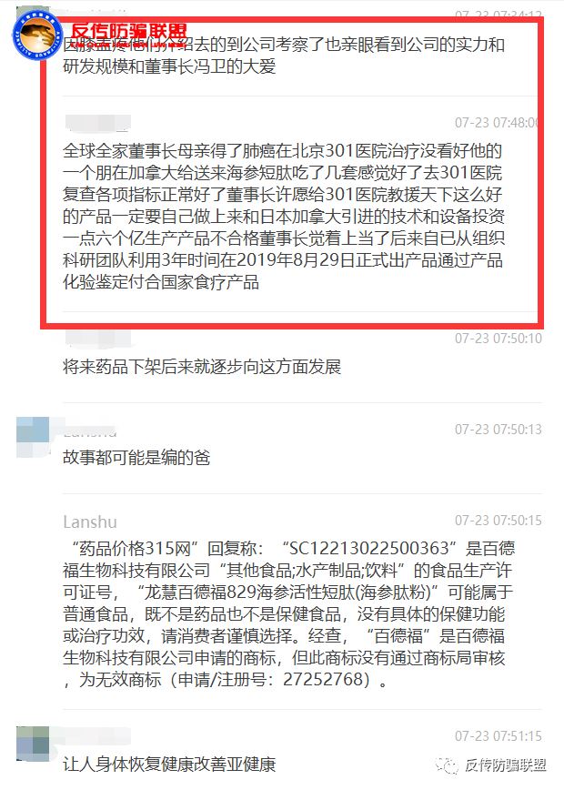 2019年6月8日,一位代理商在网上发文称百德福海参肽为癌症患者解除病痛、创造奇迹,让很多医生都感到神奇、肽是解决人类降危机的万能钥匙,补肽就是补青春、补活力、补生命! 从代理商发布的推广软文来看,百德福海参肽简直就是癌症克星,对此投诉人查询药品价格315网后得到的回复是SC12213022500363是百德福生物科技有限公司其他食品;水产制品;饮料的食品生产许可证号,龙慧百德福829海参活性短肽(海参肽粉)可能属于普通食品,既不是药品也不是保健食品,没有具体的保健功能或治疗功效,请消费者谨慎选择。经查,百德福是百德福生物科技有限公司申请的商标,但此商标没有通过商标局审核,为无效商标(申请/注册号:27252768)