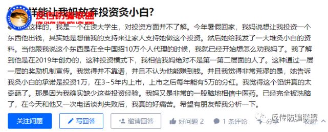 7月18日,反传防骗联盟公众号原创首发了50亿股票赠予经销商?上海灸凶公司画大饼遭多名用户投诉!一文,曝光了灸凶奖金制度涉嫌传销、兜售原始股等多项违规问题。在文章的结尾,反传防骗联盟曾对灸凶提出这样的质疑灸凶公司是敬畏法律悬崖勒马还是一意孤行将骗局蔓延到底直至崩盘跑路? 涉嫌传销、遭受处罚 近日,据相关媒体报道,灸凶及相关公司或因涉嫌传销被阳新县人民法院申请财产保全。 ![]() 图片来源:企查查 据裁判文书显示:2021年7月28日,阳新县市场监督管理局向黄石市阳新县人民法院提出非诉保全审查,被申请人为湖南艾到电子商务有限公司,明松(上海)降科技有限公司,灸凶(上海)智能科技有限公司,深圳百川艾科技有限公司,李艳芝,陈燕霞,杨萍,胡南,莫月明;案件状态正在审理。 千人大会,画饼洗脑 据一位用户向反传防骗联盟透露,就在灸凶被法院申请财产保全的前几天,灸凶连续举办了多场新品发布会: ,时长07:17 ,时长04:49 炙凶现唱会视频 视频中,近千人的会议现场大家热情澎湃,台上的讲师从如何邀约新人到如何推广讲的面面俱到,更是扬言灸凶收入没有天花板、分红累计、十万亿市场等。 多级代理、兜售原始股 ![]() 灸凶奖金制度图 据反传防骗联盟此前的报道及相关用户的投诉,灸凶平台将代理等级设为999元的个人版VIP、9990元的服务中心(合伙人)以及运营中心三大级别,其中服务中心(合伙人)又分为一星合伙人、二星合伙人、三星合伙人,运营中心也分为金牌董事、钻石董事、皇冠董事等级别。 用户投入越多,等级越高,且卖产品并非灸凶的主要收入来源,其主要盈利方式是拉人头发展下线带团队。通过让代理商认购商品变相收缴门槛费,并通过发展会员给予返利的方式来鼓励代理商拉人头的经营模式均符合传销的行为特征,灸凶明显涉嫌传销。 ![]() 除了涉嫌传销,反传防骗联盟在上篇报道中还曝光了灸凶平台还涉嫌兜售原始股,为了鼓励经销商发展下线,灸凶向经销商公开承诺赠送50亿股票也被用户质疑画大饼。 亲人深陷、家属投诉 ![]() 图片来源:百度知道 在百度知道平台,一位在读大学生用户留言今年暑假回家,我妈说想让我投资一个东西他出钱,其实她是想借我的支持来让家人支持她做这个投资。然后她给我发了一大堆灸凶的资料,当她告诉我灸凶在全中国招10万个代理的时候,我就已经开始想怎么劝我妈了。我了解到灸凶平台是在2019年创办的,这种投资模式下,我相信我妈绝对不是第一第二层级别的人了。这种通过一层一层的奖励机制宣传,我觉得并不靠谱,并且不认为该平台能赚到钱。并且我觉得非常荒谬的是,她告诉我灸凶的承诺是投资1万,在3——5年内上市,上市之后每年能有5万的分红。我觉得这个馅饼真的太奇葩了,但我又缺少这些投资经验,而我妈又非常地相信中医药,已经完全被洗脑了,在今天和她又一次电话谈判失败后,我真的好痛苦。 ![]() 有用户在该题下回答: 1.灸凶这个公司注册资本只有100万,却承诺几年内上市。请关注一下上市的要求,它就是空口白话。 2.它虽然提供产品,但是市场上同款的产品已经很多,很专业,质优价廉。它匹配的什么降管理系统,国产华为手表可监控血氧,心跳睡眠;降生态管理有各种app,应用商店搜医生二字就能出来一堆。它混淆概念,胡说八道,就是想唬住不了解目前市场形势的人。 3. 它宣传中医艾灸,却夸大它的功效,混淆针灸和艾灸的作用,说得像万能药一样,就跟以前某保健品那种虚假宣传一样的。 4. 它的盈利模式是拉人头,一人拉三个人就能回本,这些下线发展拉的人头还会给他提供提成奖励,宣称只要入会早,就能月入几十万。只要你进去就可能成为被他们收割的人头。 5.作为一个商城app要查看里面的商品还要各种授权,正规一点的商场应用app都不敢这样操作。另外,相比某东,某宝,某多里面各种购物协议,保障协议,退货协议,里面简陋得就是个钱款销赃点。 6. 谨慎家人已入坑,骗子会比你有耐心教她开信用卡,借钱,贷款,请把自己整理的资料耐心的给她讲解。如有必要,花点时间陪家人渡过这段时间,如已出现财务损失,请眷向工商局举报。 ![]() 还有用户提出共鸣我和你的情况一模一样,现在灸凶新出了智能手表,会员价999,我妈一定要买,之前加入他们会员似乎就已经花了1万,真的心累。 关联公司、经营异常 据反传防骗联盟查询,与灸凶平台相关联的公司除了其主体运营公司灸凶(上海)智能科技有限公司外,还有明松(上海)降科技有限公司、上海持枢企业管理咨询中心(有限合伙)、百川(深圳)降科技有限公司、深圳百川艾科技有限公司。 ![]() ![]() 图片来源:天眼查 值得一提的是,深圳百川艾科技有限公司在2020年12月7日因广告违法行为被深圳市市场监督管理局南山局罚款2千元。而灸凶(深圳)智能科技有限公司在2021年8月9日因通过登记的住所或经营场所无法联系被深圳市市场和质量监督管理委员会福田局列入了经营异常。 从以上处罚信息来看,灸凶平台的相关公司自2021年7月28日被法院申请财产保全,十天后的2021年8月9日又被列入了经营异常。至于灸凶平台在连续两次被罚后会如何继续运营?是否会继续如上述视频一样大张旗鼓开发布会招代理?承诺代理商的赠送50亿股票何时实现?反传防骗联盟拭目以待? (原标题:经营异常的灸凶举办千人会销洗脑再遭代理投诉:涉嫌传销、兜