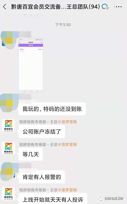 对于这样的承诺和保证,人民网也曾明确指出:谨记投资是有风险的,不宜有赌博心理而冒险入局。消费者要树立理性投资理财观念,切勿轻易相信所谓的稳赚不赔无风险、高收益宣传,不要投资业务不清、风险不明的项目。理财产品如果承诺收益率超过6%就要打问号,超过8%就很危险,10%以上就要准备损失全部本金,保本高收益就是金融诈骗。要记住投资是有风险的,别受高收益诱惑而冲动投资。 另外值得一提的是,目前一些悦拼悦有的推广人员还来自之前的黔唐百宜,关于这个拼团项目,微商电商调研此前曾在题为揭底号称四天回本的黔唐百宜,已被专家指出存在后台操控的风险、从黔唐团购到黔唐百宜,三级代理方案有何变化?的报道中有过解读,此处不多赘述。