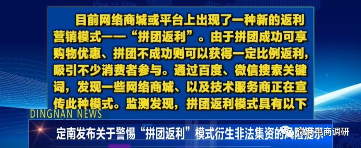 后 记 近年来,随着拼团项目的爆红,监管部门的注意力也逐渐朝向该领域转移。近期,于都、龙南、定南、珲春、满洲里、汝州等多地也先后发布了关于警惕拼团返利模式衍生非法集资的风险提示与关于拼团返利模式的预警信息,可见,随着监管部门的重视,个别涉及非法集资的拼团项目也终将是命不久矣。