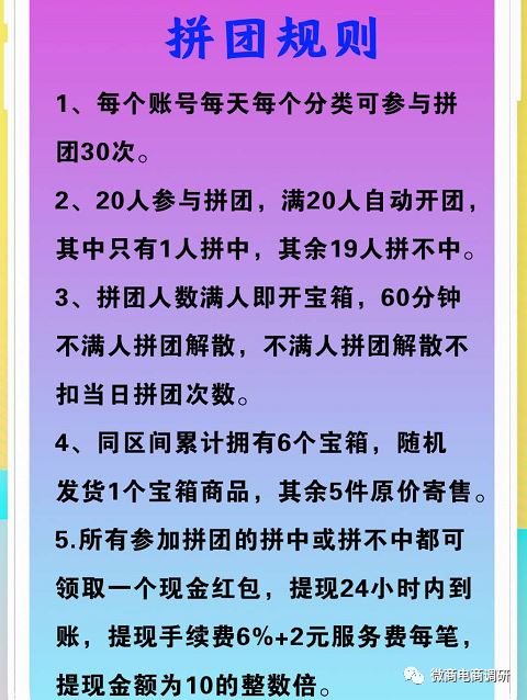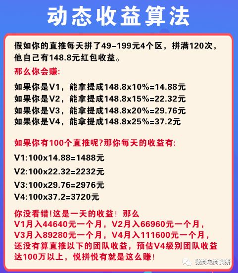 对于近段时间走红网络的拼团模式,本平台也请到了行业专家进行分析,该专家指出:十拼三或七拼二,拼中给商品,不中给出资额的5%到8%红包奖励,这类的是相对靠谱的。凡是给的红包奖励低,必然是把资金挪到后面多层次团队计酬的奖金拨比去了。 稳赚不赔,违规宣传 在有关宣传图片当中,我们还看到了稳赚不赔的字样。