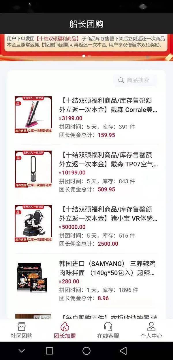 用‘船长团购’App,轻轻松松做副业,0成本月收入可达万元? 近日,湖北的胡先生向媒体反映,8月底,他在网络平台上看到了这条诱人的App宣传广告,随后下载使用,不想却遭遇陷阱。 胡先生说,从9月9号晚上开始,这款App再也打不开了,胡先生投入的钱也无法兑现,他立即向所在地警方报案。胡先生提供的转账凭证显示,他投入了58万元,他称,这些钱都未来得及提现。 湖北天门市公安局9月14日出具的立案告知书显示,船长团购非法经营案已被立为刑事案件侦办。 号称能赚钱的团购App突然关闭 胡先生告诉记者,自己8月份时从网络上了解到这款名为船长团购的应用软件。相关宣传文章称,使用这款软件可以轻松赚钱。 胡先生说,这款软件赚钱的模式是当团长,赚佣金。点开软件中团长加盟模块,就能看到供拼团的商品。商品种类包括火鸡面、小型家电、桌椅板凳等等,价格在几百到千元不等,越贵的商品可获得的佣金就越多,从几块到几十块不等。充值并购买商品后即成为团长,发起拼团后,平台会自动安排成团。 不同商品的成团周期也不同,价值高的商品成团周期会略长一点,拼团成功后,系统会将本金和佣金返还,用户可提现。 胡先生在船长团购上的第一笔生意发生在8月21日,他向记者提供的转账记录显示,他在当日上午充值了278元。他回忆,自己充值后,软件给了28元的首充奖励,随后他花费200余元购买了火鸡面商品,成为了团长,发起了拼团。仅一天时间,他就收到了本金和几块钱的佣金奖励。尝到甜头后,他加大充值频率和充值金额,购买了越来越多的商品并发起拼团。 虽说是团购,但胡先生称,他从没收到过任何商品,他也不清楚平台安排的参团人,是否收到过商品。 9月开始,平台的奖励更大了。胡先生表示,什么金秋活动,金九银十宣传了很多,平台加大了返佣金的力度。9月9日白天,平台又上架了三款商品,价格分别为3199元、10199元和50000元。平台宣传信息显示,团长能收到高额佣金和双倍本金。这让胡先生动心,当天他又充值了8万余元。