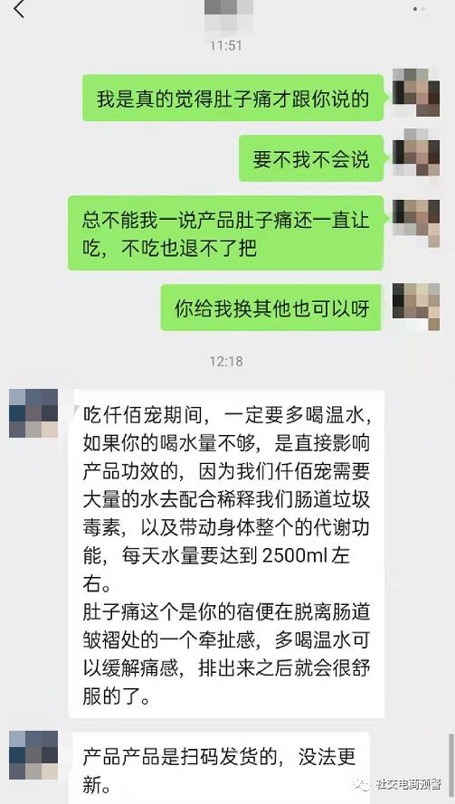 另有一受害人黄女士反映称,自己在花费三万余元购买仟佰宠饮料等产品食用后出现肚子疼、拉肚子的现象,而仟佰宠代理商给出的解释如下图: