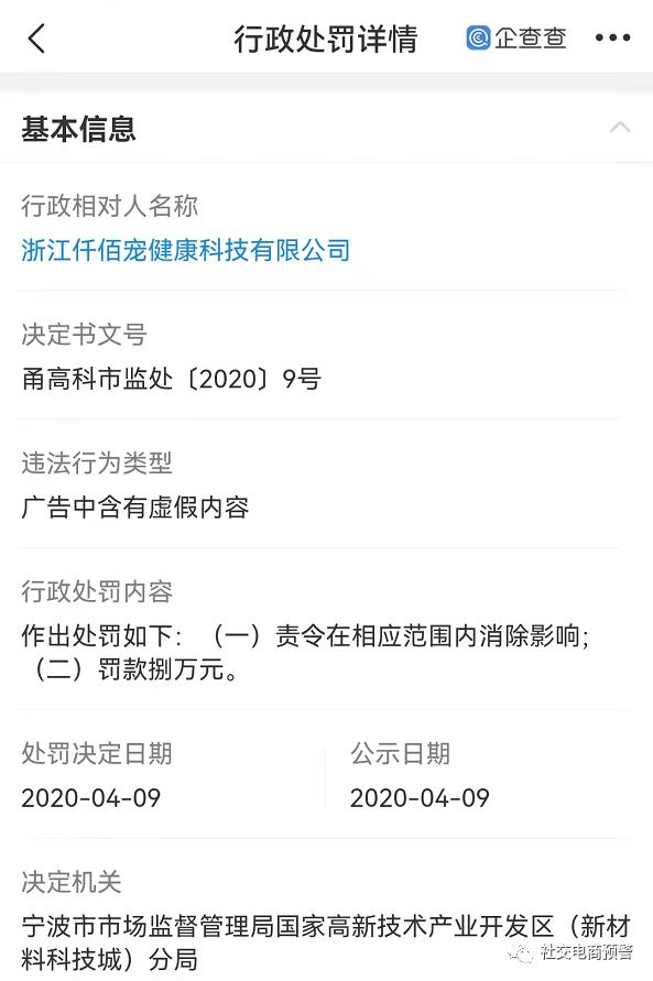 2020年4月,浙江仟佰宠降科技有限公司因广告中含有虚假内容遭罚款8万元。浙江仟佰宠降科技有限公司持有仟佰宠商标。 尽管几经变更,从受害人提供的资料显示,浙江神首和浙江仟佰宠的之间的关联依然紧密。