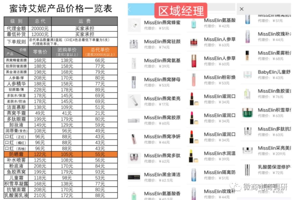 实际上,该款产品也是国产非特殊用途化妆品,备案编号为为闽G妆网备字2018003811,由蜜诗艾妮生物科技(厦门)有限公司委托珠海伊斯佳科技股份有限公司所生产。 至于上述产品在宣传中涉及到的消炎等医疗作用,对此,我国化妆品标签管理办法第二十一条显示,化妆品标签禁止标注或宣称下列内容:(一)使用医疗术语、医学名人的姓名、描述医疗作用和效果的词语或已经批准的药品名明示或者暗示产品具有医疗作用的;(七)通过宣称所用原料的功能暗示产品实际不具有或不允许宣称的功效的;(八)普通化妆品宣称特殊化妆品相关功效,或非化妆品通过标注化妆品相关许可或备案号让消费者误认为是化妆品的。 并且,我国化妆品监督管理条例第三十七条也对于上述宣传行为也有明确规定:化妆品标签禁止标注下列内容:(一)明示或者暗示具有医疗作用的内容;(二)虚假或者引人误解的内容;第四十三条对于化妆品广告宣传也有所提及:化妆品广告的内容应当真实、合法。化妆品广告不得明示或者暗示产品具有医疗作用,不得含有虚假或者引人误解的内容,不得欺骗、误导消费者。 五级代理,充值模式 文章的最后,我们再把目光集中到蜜诗艾妮现行的代理制度上,据经销商小丽(化名)介绍称,蜜诗艾妮的模式其实是分享式的体验式营销,并且是充值型的模式,关于制度本身她提供了如下资料: 一、等级 该模式一共分为VIP,VVIP,总代,大区,合伙人5个等级。 二、如何加入 VIP:充值1000元成为VIP,并且享受VIP价;VVIP(超级会员):充值5000元成为VVIP(超级会员),享受VVIP(超级会员)价;总代理:充值20000元成为总代理,并且享受总代理价;大区代理(区域经理):充值80000元成为大区代理(区域经理),并且享受大区代理(区域经理)价;合伙人:充值180000元成为合伙人,并且享受合伙人价。 关于等级,小丽介绍说:这个是一次性充值达到相对应的等级并不能通过累计充值来提升等级。会员价格与超级会员价格: