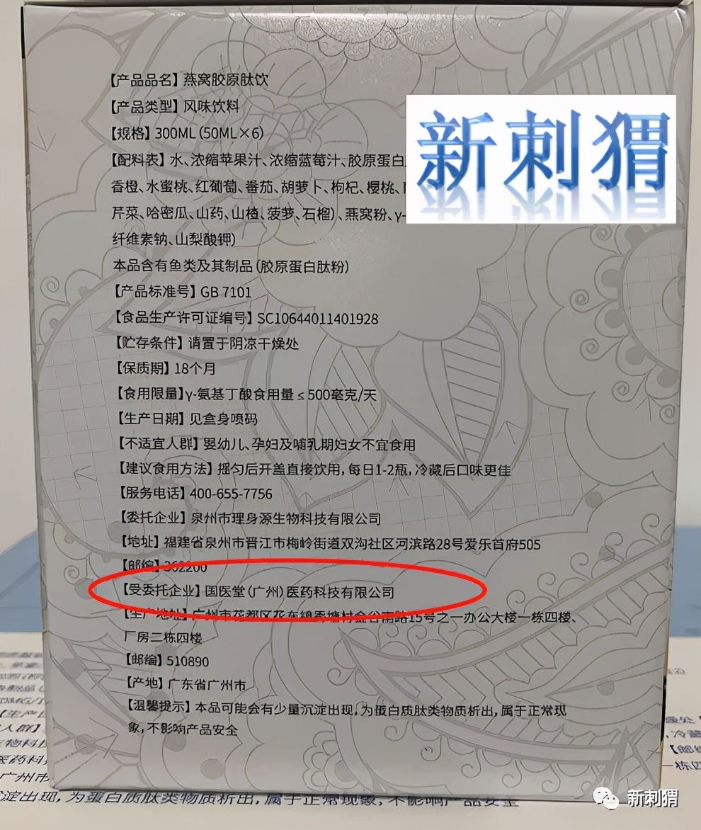 我们从理身源的官方微信公众号了解到,理身源透明质酸钠水光饮饮品和理身源透明质酸钠胶原肽饮是和国药集团共同一起研发,生产,销售的产品,但实际产品外包装并没有国药的LOGO,而生产企业为:国医堂(广州)医药科技有限公司。在官方的微信公众号堂而皇之打着国药集团欺骗消费者。