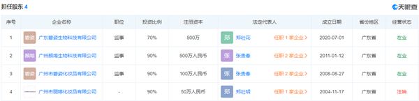 根据股权穿透图,广州市丽婷化妆品有限公司法定代表人郑壮明持股10%,另外90%由陈贵龙持有。同时,陈贵龙分别在广东碧姿生物科技有限公司、广州颜埠生物科技有限公司、广州市碧姿化妆品有限公司担任监事。