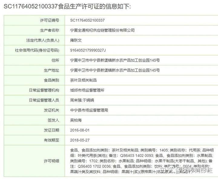 但实际上,该产品仅是普通食品,并非保健食品或药品。根据SB/T 10347-2017 糖果 压片糖果的规定,压片糖果是以食糖或糖浆(粉剂)或甜味剂等为主要原料,经混合、造粒或不造粒、压制成型等相关工艺制成的固体糖果。此外,根据食品生产许可分类名录,压片糖果在糖果制品中,类别编码1301。显然,压片糖果属于普通食品糖果类。 据三里人家食品专营店提供的资料显示,该产品的许可证号为SC11764052100337,生产厂家为宁夏全通枸杞供应链管理股份有限公司。