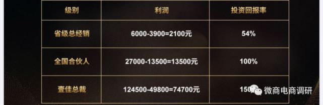 从其模拟利润算法表中我们看到:省级总经销投资回报率为54%;全国合伙人的投资回报率为100%;壹佳总裁的投资回报率为150%。用经销商的话来说,利润和投资回报率,其实就是零售赚取差价所获得的利润。 批发利润(级差奖):经销商小燕介绍称,在嘉珀莉的制度中,复购拿货是通过上下级的关系拿货,比如A招的代理都是从A这里拿货。