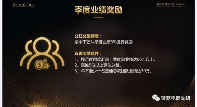 季度业绩奖励(股东分红):达到壹佳总裁级别,并且季度总业绩达到80万以上,直推5位以上的壹佳总裁,并且属于自己所推荐的壹佳总裁团队达到30万,便可获得季度业绩奖励:自己团队下的季度业绩的3%。