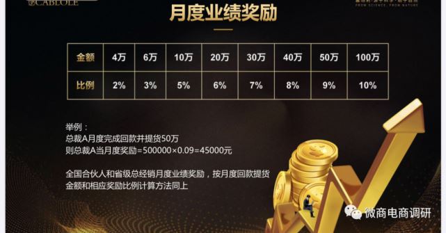 自然月业绩奖励:当各级别代理营业额达到不同梯度会有不同的奖励。4万:奖励4万的2%;6万:奖励6万的3%;10万:奖励10万的5%;20万:奖励20万的6%;30万:奖励30万的7%;40万:奖励40万的8%;50万:奖励50万的9%;100万:奖励100万的10%。