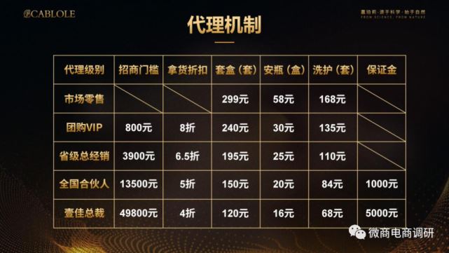 一、等级 在嘉珀莉的经销商体系中,一共分为5个等级,分别是市场零售、团购VIP、省级总经销、全国合伙人、壹佳总裁。 二、如何加入 市场零售:0门槛加入,实则上并不能算到代理体系之中;团购VIP:一次性拿货800元,后续享受8折复购价;省级总经销:一次性拿货3900元,后续享受6.5折复购价格;全国合伙人:一次性拿货13500元,后续享受5折复购价;壹佳总裁:一次性拿货49800元,后续享受4折复购价。 三、赚钱模式 为什么有部分经销商敢称嘉珀莉的投资为负风险投资,也许模拟利润算法表会给出答案: