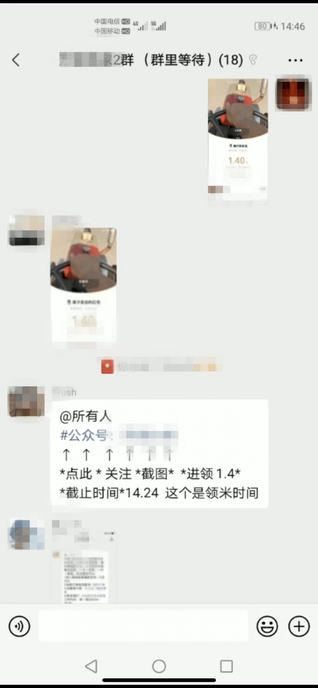 几秒钟后,民警点开红包领取的记录,发现30个群成员每人领取的都是1.5元的红包。 过了一会,群主通知,需要加入任务群才能继续领取红包,通过扫描群里的二维码,民警又加入了2群(群里等待),进群后,有三四个群成员会在群里发送任务,最开始的任务是关注微信公众号,并在完成任务后截屏发送到该群,证明自己完成了任务。