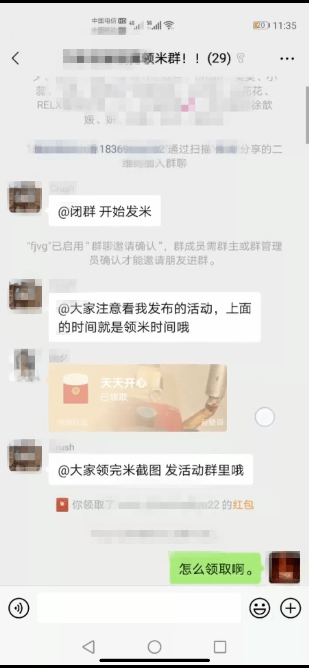 每一次群里发布任务后一两分钟,群主就会发红包让大家抢。这种类型的任务,民警一天完成了四五十个,共兼职刷单获利60元左右。 民警分析 利用碎片时间,点点手机屏幕,就可以轻松获利,虽然不多,但胜在轻松。轻松、自由、零成本获利,这是刷单型诈骗让受害人一开始就情不自禁、感觉自己找到金矿的感觉。 2 制定规则、纪律,让受害人感觉操作很正规。 在完成任务的过程中,民警偶尔故意通过复制、转发他人的截屏滥竽充数,一下子就被群主发现,并被通报。 群里发送任务还固定上下班时间:上午10:00-11:30、下午14:00-16:30,其他时间段,群众会安排抢红包游戏,群成员表演才艺和感言。任务完成后,也规定了完成任务、领权酬的的截止时间,让群成员感觉该群是一个非常正规的兼职刷单群。 民警分析 劳逸结合、软硬兼施,进行群文化的软性输出,特别是群成员的才艺表演、感言,均透露出兼职刷单大有可为,获利很丰厚,让受害人对兼职刷单获利的心理预期不停膨胀。 3 不停换群,对群成员的忠诚度进行筛选。 发布任务和领权酬的群,每半天就会进行更换。时间一到,群主就会在群里告诉发布通告,让所有群成员,扫码加入新的群,重新领取任务、领取红包。 民警分析 频繁的退群、加群操作,是骗子检验群成员兼职刷单获利的欲望是否强烈,对兼职刷单的工作是否可继续坚持,通过筛选,将对兼职刷单的受害人一步一步引向深渊。 4 任务升级,检验受害人是否愿意垫钱刷单。 第一天卧底结束,受害人金某告诉民警,她之前被骗也是一模一样的方式,接下来群里会发布需要垫付蓄资金的刷单任务。 果然,到第二天接近中午,发布任务的群里推送任务:网商冲量返米单,只为商家冲量并无货物发出,暂时无货,不出售挂空单!每人仅此只能做一次,要做的进核算群,不做的不要进。名额20个,完成商家指派的20个名额可共享30米福利。