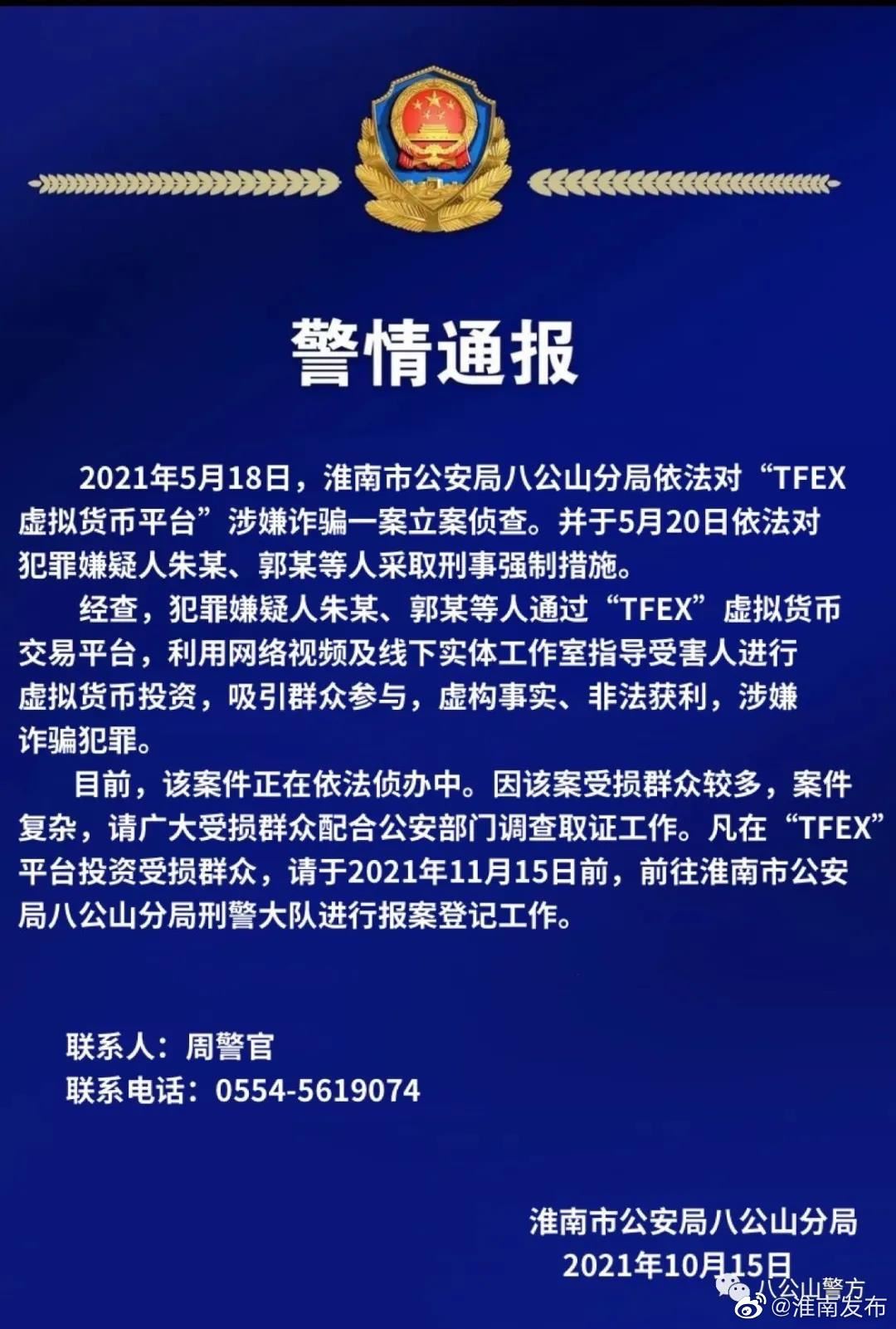 2021年5月18日,淮南市公安局八公山分局依法对TFEX虚拟货币平台涉嫌诈骗一案立案侦查。并于5月20日依法对犯罪嫌疑人朱某、郭某等人采取刑事强制措施。 经查,犯罪嫌疑人朱某、郭某等人通过TFEX 虚拟货币交易平台,利用网络视频及线下实体工作室指导受害人进行虚拟货币投资,吸引群众参与,虚构事实、非法获利,涉嫌诈骗犯罪。 目前,该案件正在依法侦办中。因该案受损群众较多,案件复杂,请广大受损群众配合公安部门门调查取证工作。凡在TFEX平台投资受损群众,请于2021年11月15日前,前往淮南市公安局八公山分局刑警大队进行报案登记工作。 编辑 许大鹏 |