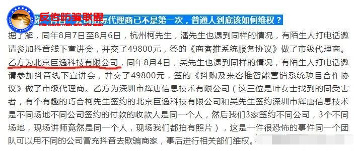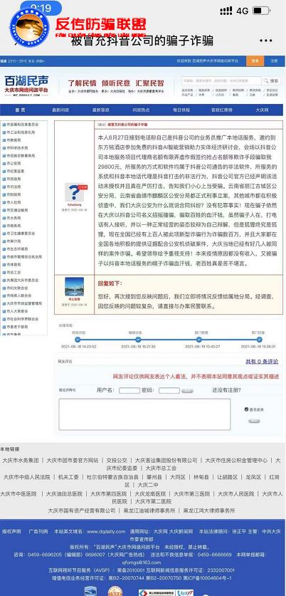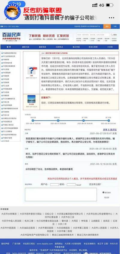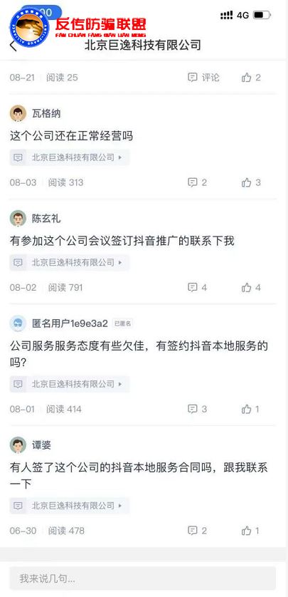(上图来自天眼查信息截图) 无独有偶,反传联盟微信公众平台守护壹哥在大庆市网络问政平台上发现一起时间为2021年8月7日投诉北京巨逸科技有限公司的案例。 市民王朝(网名)反应情况如下:领导们好:7月17日,北京巨逸科技有限公司自称抖音工作人员邀约,7月19日大庆富力喜来登酒店3楼,举办抖音本地生活招商会场利用抖音授权招商城市代理,后经过抖音官方反馈,抖音没有任何关系,属于冒充抖音工作人员行为,招商会抖音本地生活板块代理也属于蒙骗,所服务软件是智推系统属于非法软件,隐智推系统是抖音打击的非法软件事实,这行为就是诈骗行为。云南省丽江古城区公安分局,云南省曲靖市麒麟区公安分局都正式刑事立案,其他城市都在积极侦查中,我们大庆公安为什么就说合同纠纷?现在,北京巨逸科技有限公司没有人,打电话有人接听,不说具体位置,我们想协商都见不到人,希望领导给予支持>来疫情原因都没有收入,又被骗,老百姓太难了。 大庆市公安局回复:您好,已将您反映的情况反馈属地分局领导,已安排相关民警进行办理。 市民王朝(网名)后续评论如下:昨天,在萨尔图区公安分局的帮助下,骗子公司已经全额退款,追回损失,感谢萨区分局支持与帮助!我是遇到打着抖音幌子的骗子公司被诈骗的当事人。感谢萨区公安分局警官的支持与帮助。骗子害怕了。骗子公司已经全额退款,挽回损失。再次谢萨区公安分局,为老百姓做事实! 与此同时,下方还有跟帖说8月份刚签订协议的,问怎么挽回损失,希望政府重视。另外守护壹哥还查询到8月18日网名为liuhaijiang的投诉留言,一并附图如下: