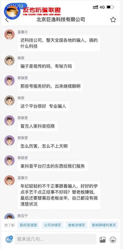 现在他们的工作人员矢口否认说自己从来没有宣导过自己是抖音公司的,拒不退款,态度强硬。 截止目前,李先生已经报警了。当地派出所很快就打电话给他,而且对信息很了解,没等李先生开口,警察就问是不是对方是一家叫北京巨逸的公司?原来已经接到好几起报案了。因为时间比较晚,先做了电话笔录,第二天将去派出所做详细笔录。 李先生说,希望借助反传联盟微信公众平台说一下他自己的亲身感受,算是对社会大众的一个警示: 这里也奉劝大家,做投资、做项目前,一定要先了解清楚。尤其是现痴围搞的很紧张很刺激的,错过就好像错过一个亿,逼你催你付款的那种,遇到了一定要谨慎。天上不可能掉馅饼,只可能是陷阱,好的项目不会无缘无故砸到你头上!不管钱多钱少,都是自己的血汗钱,辛苦钱。被骗的钱,给老婆孩子换新衣服,吃点好吃的不香吗?! 北京巨逸科技有限公司已频频遭投诉 为何屡犯不改? 本站编辑通过天眼查获悉:北京巨逸科技有限公司成立于2021年6月3日,认缴资本500万元,实缴出资额为0元,法定代表人为武国斌。在天眼查的信息中,我们发现大量的网友热聊公司存在诈骗行为,如下图: