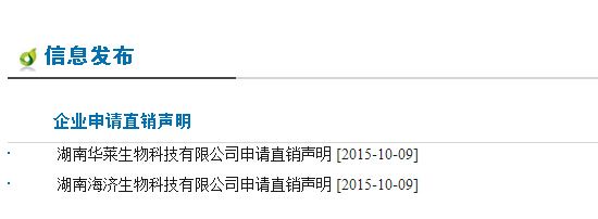 值得注意的是,当中的湖南海济生物科技有限公司(简称:海济生物)为准直销企业,据商务部官网显示,海济生物曾与同省兄弟企业华莱生物共同向商务部申请直销牌照,申请公示的日期为2015年10月9日。不过随着权健事件的发生,商务部对直销牌照的审批按下了暂停键,其原有的受理公示信息也已不再对外公示,至今湖南海济也未能获得商务部颁发的直销牌照。