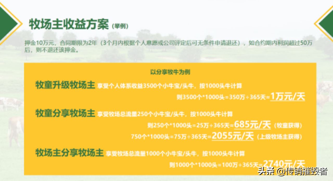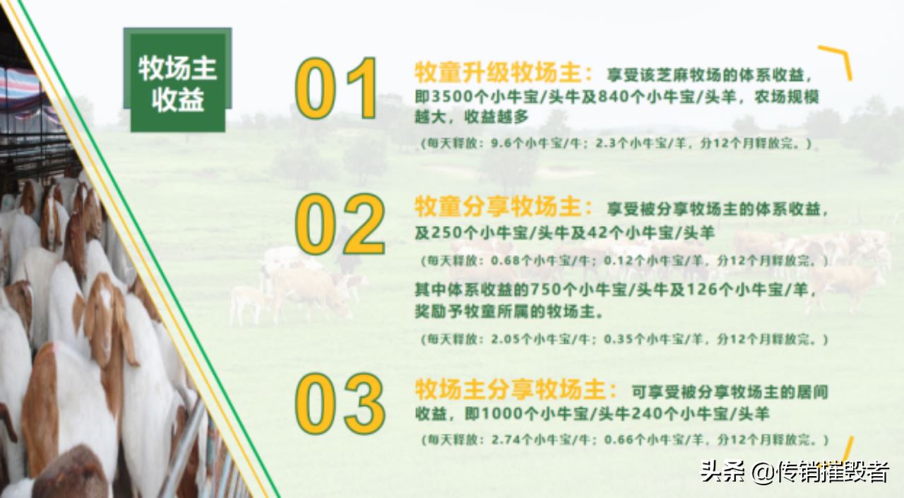 其中,牧童升级牧场主:享受该芝麻牧场的体系收益,即3500个小牛宝/头牛及840个小牛宝/头羊,农场规模越大,收益越多。(每天释放∶9.6个小牛宝/牛;2.3个小牛宝/羊,分12个月释放完。) 牧童分享牧场主∶ 享受被分享牧场主的体系收益,及250个小牛宝/头牛及42个小牛宝/头羊(每天释放∶0.68个小牛宝/牛;0.12个小牛宝/羊,分12个月释放完。其中体系收益的750个小牛宝/头牛及126个小牛宝/羊)。 牧场主分享牧场主∶ 可享受被分享牧场主的居间收益,即1000个小牛宝/头牛240个小牛宝/头羊(每天释放∶2.74个小牛宝/牛;0.66个小牛宝/羊,分12个月释放完。) 牧场主收益举例显示,押金10万元,合同期限为2年(3个月内根据个人意愿或公司评定后可无条件申请退还),如合约期内利润超过50万后,则不退还该押金。 以分享牧牛为例:牧童升级牧场主,享受个人体系收益3500个小牛宝/头牛,按1000头牛计算:3500个*1000头=350万∶365天≈1万元/天。牧童分享牧场主:享受牧场总流量250个小牛宝/头牛,按1000头牛计算。牧童获得250个*1000头=25万∶365天≈685元/天。750个*1000头=75万÷365天~2055元/天(上级牧场主获得):牧场主分享牧场主,享受牧场总流量1000个小牛宝/头牛,按1000头牛计算:1000个*1000头=100万∶365天~2740元/天。