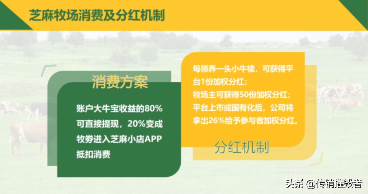 芝麻牧场消费及分红机制:每领养一头小牛犊,可获得平消费方案台1份加权分红;牧场主可获得50份加权分红;平台上市或国有化后,公司将账户大牛宝收益的80%,拿出26%给予参与者加权分红,可直接提现,20%变成牧券进入芝麻小店APP,分红机制抵扣消费。 根据禁止传销条例第七条下列行为,属于传销行为: (一) 组织者或者经营者通过发展人员,要求被发展人员发展其他人员加入,对发展的人员以其直接或者间接滚动发展的人员数量为依据计算和给付报酬(包括物质奖励和其他经济利益,下同),牟惹法利益的; (二) 组织者或者经营者通过发展人员,要求被发展人员交纳费用或者以认购商品等方式变相交纳费用,取得加入或者发展其他人员加入的资格,牟惹法利益的; (三) 组织者或者经营者通过发展人员,要求被发展人员发展其他人员加入,形成上下线关系,并以下线的销售业绩为依据计算和给付上线报酬,牟惹法利益的。 寻山优品因涉嫌传销被查 2018年3月,曾凡永伙同李拥军、屈娟等人在注册成立拥德公司及多家关联子公司后,开发了名为寻山农场后又更名为寻山优品的APP网络平台,通过该平台,以预售寻山小香鸡为名,以高额返利为诱饵,要求参加者以购买商品的方式获得加入资格,并按照上下线顺序组成层级,直接或者间接以发展会员的数量作为返利的依据,引诱参加者继续发展他人参加。为掩人耳目、制造假象,公司还拿出部分资金从事养殖小香鸡及其配套经营活动。