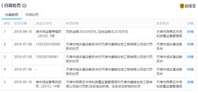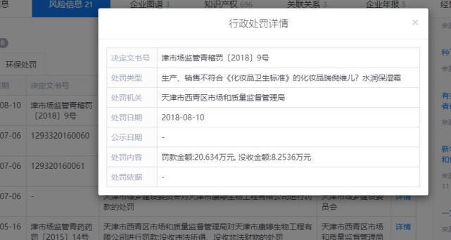 启信宝显示,康婷身背6次行政处罚,最近一次是2018年8月10日,因为生产、销售不符合化妆品卫生标准的化妆品瑞倪维儿水润保湿霜被罚款20.634万元,没收8.2536万元。2016年5月16日,康婷也曾因为生产、销售不符合法定要求产品被处罚。