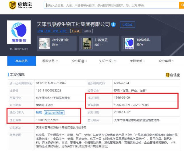 有媒体报道,福建的肖先生妻子因为康婷要和自己离婚,现在孩子也不管了,心里只想着钱,康婷的人还怂恿她跟我离婚。 启信宝显示,肖先生所说的康婷是一家以研发、生产、销售降食品、保健食品和化妆品的生物科技企业,总部位于天津,全称为天津市康婷生物工程有限公司,成立于1996年9月9日,已经有20多年的历史,法定代表人为杨琪,注册资本达1.6亿人民币。