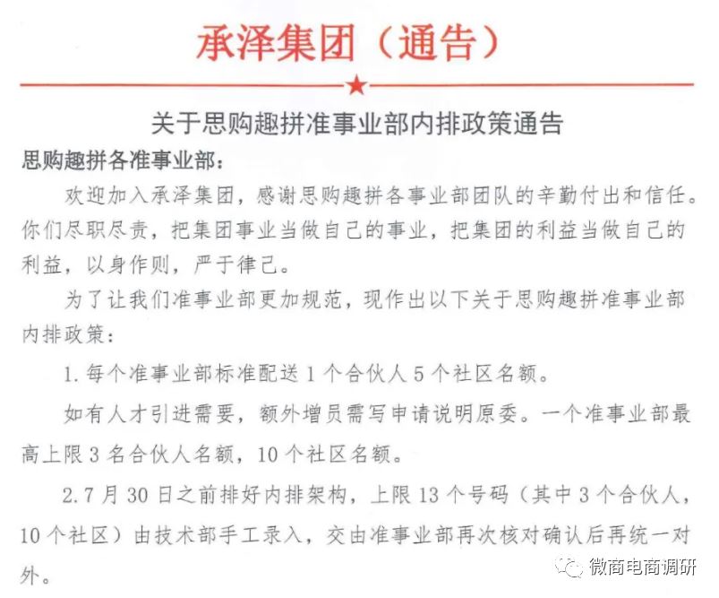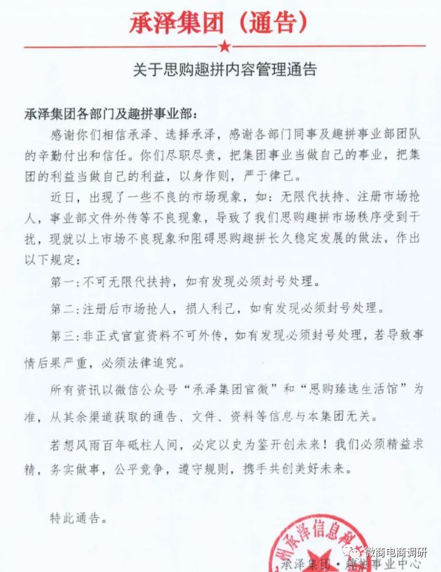 美商社ID:NewMSS 专注于美妆新零售。更前沿、更理性、更深度的行业内容,尽在美商社。 微商电商调研原创 在网购逐渐深入大众生活的当下,拼团模式也开始在线上展现出了其与众不同的吸引力,在社交电商、新零售等行业蓬勃发展的时期占据了一席之地。但回首过往,在刚刚过去的2020年,很多曾红极一时的拼团项目都已经销声匿迹了,其原因无外乎以下几点:模式泡沫太大;产品价格虚高;后勤保障不够,公司实力不足;一些大企业、上市公司开始进军拼团行业等。在这样的背景下,号称不会重蹈这些拼团项目覆辙的思购趣拼在2021年的盛夏闯入了大众的视野。 那么这个思购趣拼是一家怎样的平台?以拼团收益+产品收益+秒杀收益+直播分佣+地推补贴+广告补贴为特色的思购趣拼现行的奖金制度该如何解读?为什么行业专家认为其模式是典型的打着拼团名义的拉人头、多层次、团队计酬模式?所谓的承泽集团有何实力?思购臻选与之有何相关?加入思购趣拼,不管风吹雨打,每天躺赢30元的说法是否有据可依? 01承泽集团,真是集团? 据资料介绍,思购趣拼app是一个新上线的拼团购物平台,隶属于承泽集团,用户可以采购各类需求的产品,是一款一站式的下单的综合软件。调查发现,公众号思购趣拼的认证主体为广州安家净水科技有限公司,该公司原名广州华京电子科技有限公司,从工商信息层面,看不出该公司与承泽集团旗下几家公司有任何关联,可能只是某个团队长或推广人员开设的公众号,目前该公众号已搜索不到。 在不久前的2021年7月12日,承泽集团趣拼事业中心针对上述现象发布了关于思购趣拼内容管理通告,该通告指出:所有资讯以微信公众号承泽集团官微和思购臻选生活馆为准,从其余渠道获取的通告、文件、资料等信息与本集团无关。