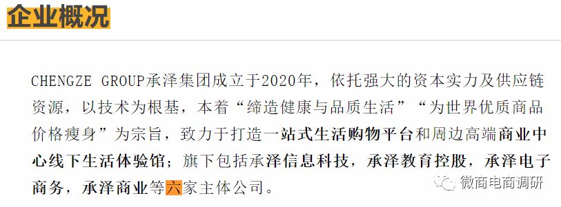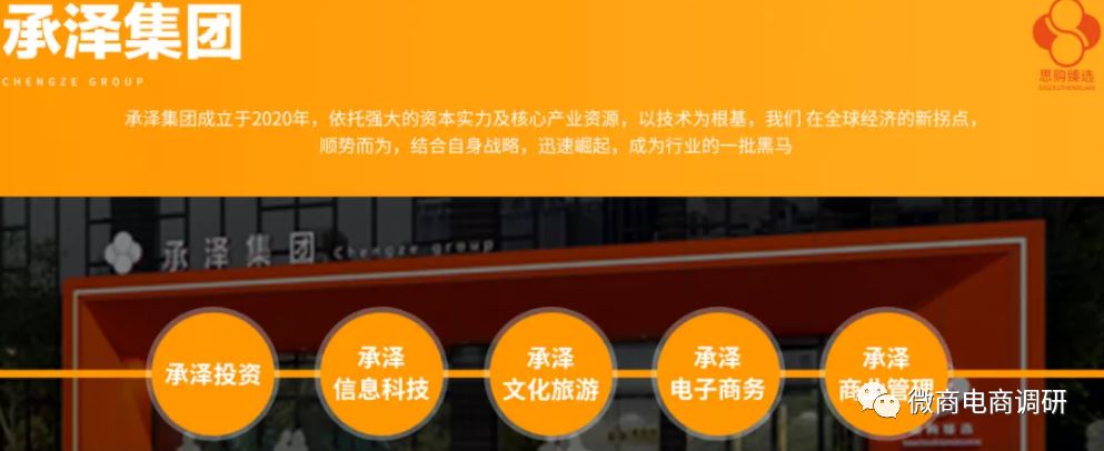 下面,我们再来看看所谓的承泽集团到底是一家怎样的集团,据有关资料介绍,承泽集团成立于2020年,依托强大的资本实力及产业上游资源,以技术为根基,本着缔造降与品质生活为世界优质商品价格革命的宗旨,致力为每个家庭打造线上?站式生活购物平台及周边商业中心大型线下生活体验馆;旗下包括承泽投资,承泽信息科技,承泽教育控股,承泽电子商务,承泽商业等六家主体公司(不知道写下这份资料的人是不是不识数,上述只有五家公司的名称,而非六家)。