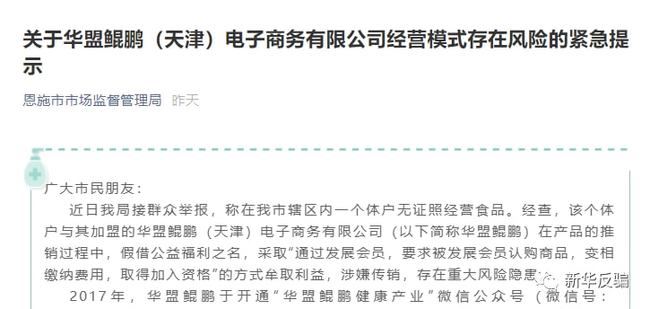 反骗举报34分享至![]() 全文如下: 广大市民朋友: 近日我局接群众举报,称在我市辖区内一个体户无证照经营食品。经查,该个体户与其加盟的华盟鲲鹏(天津)电子商务有限公司(以下简称华盟鲲鹏)在产品的推销过程中,假借公益福利之名,采取通过发展会员,要求被发展会员认购商品,变相缴纳费用,取得加入资格的方式牟取利益,涉嫌传销,存在重大风险隐患。 2017年,华盟鲲鹏于开通华盟鲲鹏降产业微信公众号(微信号:hmmfsc),并在微信公众号搭建华盟降产业服务平台福利产品申领平台,其具体经营模式为: (一)层级关系。通过扫描推荐人的二维码进行注册即可成为普通会员,会员按照缴费申领产品的先后顺序组成层级,并以申领产品的多少和发展下线的人数将会员分为不同等级。普通会员在微信公众号华盟降产业服务平台申领2000元80盒产品,升级成为服务专员(志愿者);普通会员申领20000元800盒产品,升级成为服务机构(服务中心);下线中有3个服务机构升级成为管理员。 (二)计酬方式。服务专员推荐下线申领产品,可获得下线申领产品30%的返利;服务机构的下级为服务专员的,专员申领产品获得5元,服务机构获得2.5元,下级为普通会员申领产品的,服务机构获得7元;管理员每成立一个服务机构一次性获得6000元。 为保护您的财产安全,请自觉抵制非法传销活动,谨防上当受骗。任何组织和个人不得从事传销活动。传销资金不受法律保护。传销举报电话:12315、110。 恩施市市场监督管理局 2021年10月28日 来 源:恩施市市场监管局 要说对这个公司华盟公益活动的调查,还得看新华反骗的这篇文章,,早在一年前2020-08-04就全网首发提醒大家了,果然,现在官方也出来提醒了。如果大家再继续跳坑,那你即将面临的结果,将会是众多互联网难民结果中的一种结果,惨!每期文章都在提醒大家。看到这篇文章的粉丝大可转发提醒身边人。多救一个是一个 |