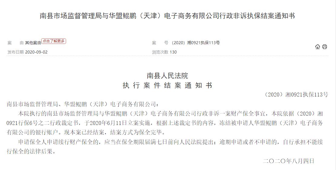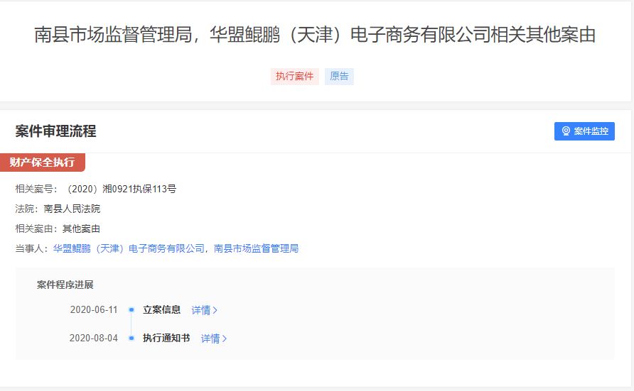 值得注意的是,2020年6月11日,据(2020)湘0921执保113号显示,华盟鲲鹏被南县市场监督管理局进行过财产保全。
