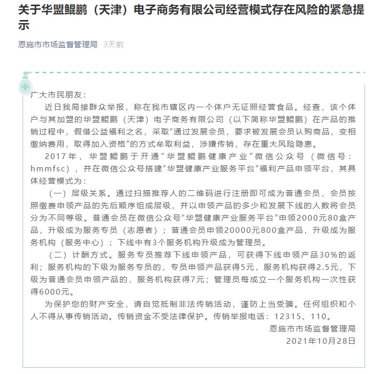 10月28日,微信公众号名为恩施市市场监督管理局发布题为关于华盟鲲鹏(天津)电子商务有限公司经营模式存在风险的紧急提示(简称:紧急提示),据紧急提示显示,近日我局接群众举报,称在我市辖区内一个体户无证照经营食品。经查,该个体户与其加盟的华盟鲲鹏(天津)电子商务有限公司(以下简称华盟鲲鹏)在产品的推销过程中,假借公益福利之名,采取通过发展会员,要求被发展会员认购商品,变相缴纳费用,取得加入资格的方式牟取利益,涉嫌传销,存在重大风险隐患。 2017年,华盟鲲鹏于开通华盟鲲鹏降产业微信公众号(微信号:hmmfsc),并在微信公众号搭建华盟降产业服务平台福利产品申领平台,其具体经营模式为: (一)层级关系。通过扫描推荐人的二维码进行注册即可成为普通会员,会员按照缴费申领产品的先后顺序组成层级,并以申领产品的多少和发展下线的人数将会员分为不同等级。普通会员在微信公众号华盟降产业服务平台申领2000元80盒产品,升级成为服务专员(志愿者);普通会员申领20000元800盒产品,升级成为服务机构(服务中心);下线中有3个服务机构升级成为管理员。 (二)计酬方式。服务专员推荐下线申领产品,可获得下线申领产品30%的返利;服务机构的下级为服务专员的,专员申领产品获得5元,服务机构获得2.5元,下级为普通会员申领产品的,服务机构获得7元;管理员每成立一个服务机构一次性获得6000元。 公开信息显示,华盟鲲鹏(天津)电子商务有限公司(简称:华盟鲲鹏)位于天津滨海新区,主营业务涉及降产业服务、贸易、商城、物流等领域。自2017年设立华盟降产业服务平台,以努力、诚信、创新、融合的经营理念,秉承踏实做事,用心对人的态度服务于大众,致力于打造人人都能享受得起的高品质降福利平台,吸引到了众多生产企业和公益慈善组织的参与及大力支持,赢得了社会公众的广泛认同。