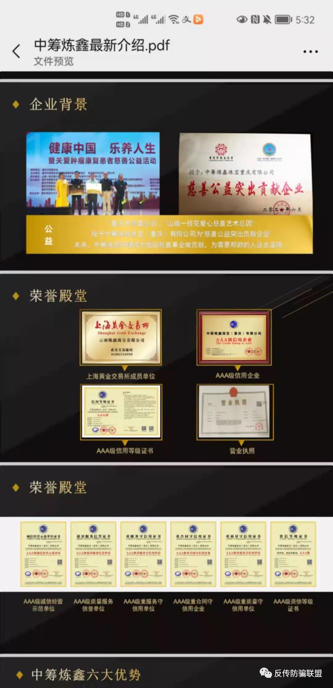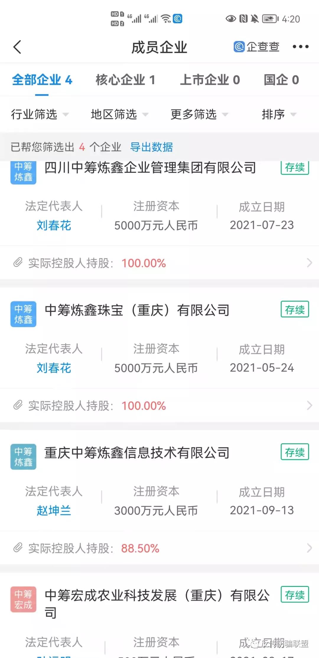 消费全返基本不是传销就是诈骗,而买黄金送积分不断释放积分,来进行全返。这样的好事你能相信吗? 公司刚注册信用证书全靠买 根据宣传资料显示中筹炼鑫集团由四川中筹炼鑫企业管理集团有限公司,中筹炼鑫珠宝(重庆)有限公司,重庆中筹炼鑫信息技术有限公司,中筹宏成农业科技发展(重庆)有限公司组成。实际控制人:刘春花。