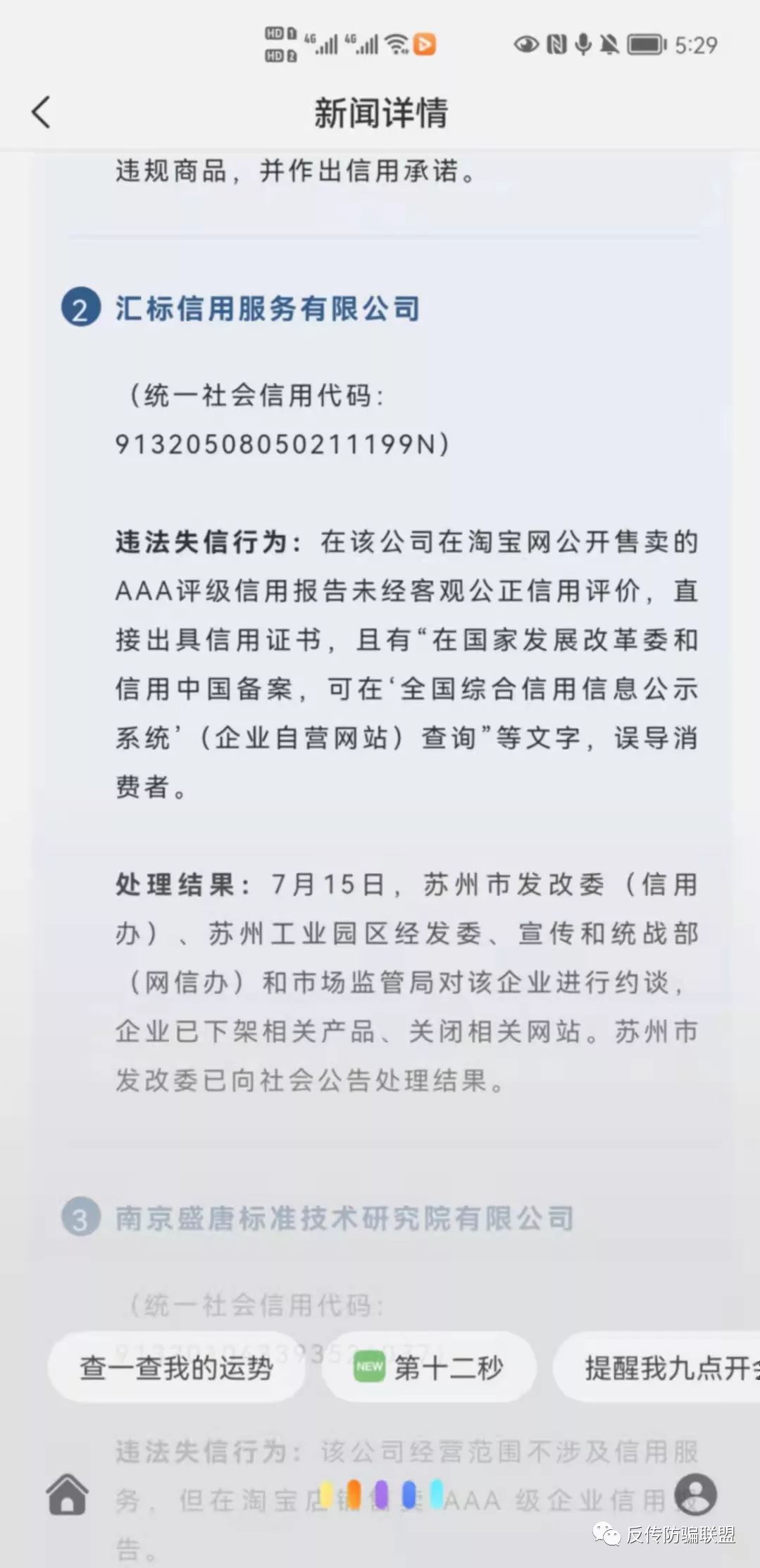 汇标信用服务有限公司 (统一社会信用代码:91320508050211199N) 违法失信行为:在该公司在淘宝网公开售卖的AAA评级信用报告未经客观公正信用评价,直接出具信用证书,且有在国家发展改革委和信用中国备案,可在‘全国综合信用信息公示系统’(企业自营网站)查询等文字,误导消费者。 处理结果:7月15日,苏州市发改委(信用办)、苏州工业园区经发委、宣传和统战部(网信办)和市场监管局对该企业进行约谈,企业已下架相关产品、关闭相关网站。苏州市发改委已向社会公告处理结果。 目前该证书网站已经关闭。
