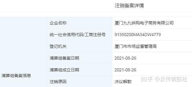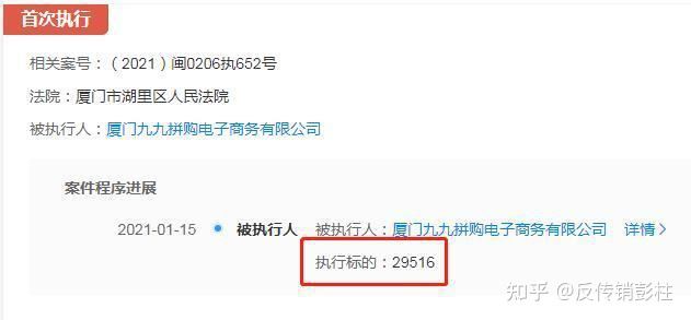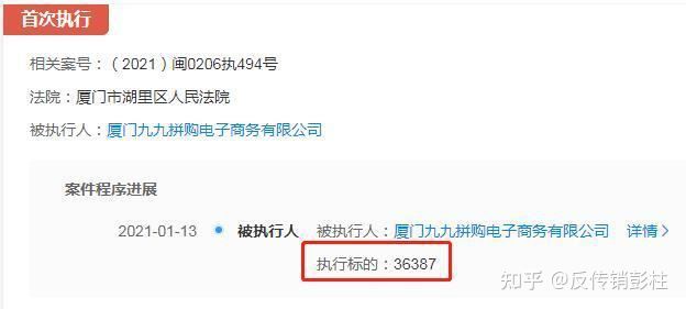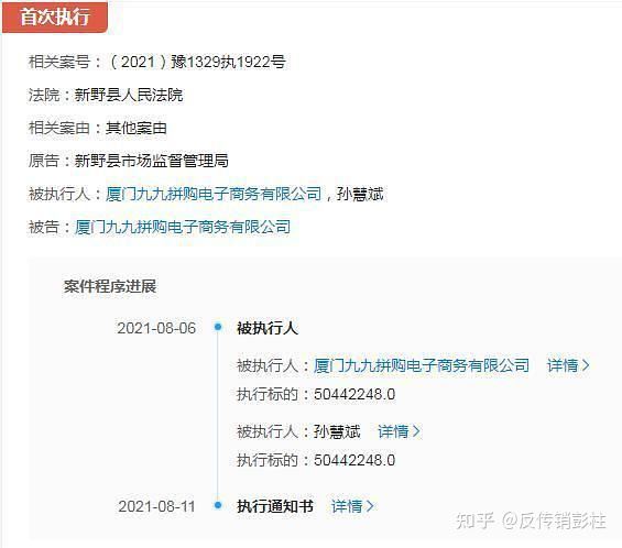 中国网财经9月15日讯(记者 段思琦)近日,中国裁判文书网公布一则结案通知书,显示,被执行人厦门九九拼购电子商务有限公司(以下简称九九拼购)、孙慧斌非法传销一案,经法院强制执行,被执行人九九拼购、孙慧斌已履行完毕,执行标的为5044.22万元。 据天眼查APP显示,九九拼购成立于2020年7月22日,注册资本为100万元,孙慧斌担任执行董事、经理及法人,持股65%,王晓聪持股35%。 ![]() 图片来源:天眼查 值得注意的是,今年1月13日,九九并购被列为被执行人,执行标的为36387元。 ![]() 图片来源:天眼查 1月15日,九九并购再次被列为被执行人,执行标的为29516元。 ![]() 图片来源:天眼查 8月6日,九九拼购又一次被列入被执行人,执行标的为50442248元。 据公开信息显示,九九拼购是一家专注于S2C拼团模式的社区电商平台。此前据相关媒体披露,九九拼购平台宣传30人团分为99元专区、799专区、1499专区,30人自动拼团成功后,系统将随机选取1人拼团成功,拼团成功者将获得相应数量的能量券,可至能量商城兑换商品,未拼中者扣除的金额则返还到余额,并获得相应的广告红利。 ![]() 图片来源:天眼查 此外,据天眼查APP还显示,2021年08月26日,九九拼购因决议解散,拟向公司登记机关申请注销登记。 编辑于 09-16 |