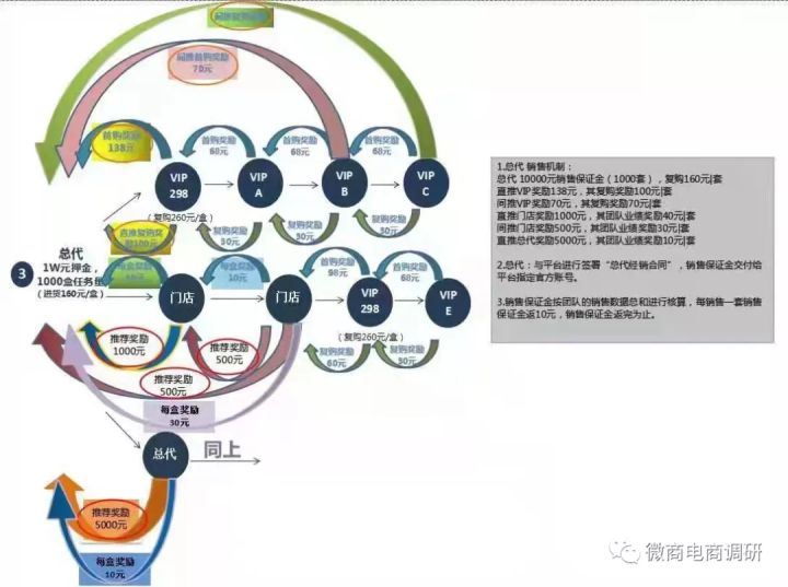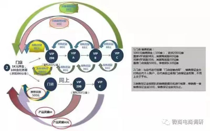 VIP之上的层级叫做门店代理,需要交1000元押金,认购100盒齐鲁仁尊堂护颜精华液,每盒产品的进货价为200元,成为门店代理后,直推VIP奖励98元,加上10元的销售补贴奖励,共计得奖励108元。VIP复购价格为260元每盒,门店代理可获得60元加10元的复购奖。间接推荐VIP奖励30元,其复购奖励30元每套。直推门店代理直接奖励500元,还享受团队10元每套的平级补贴。