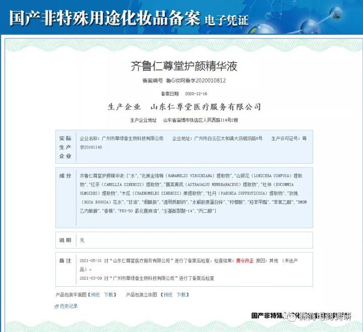山东仁尊堂医疗服务有限公司创始人杨浩 公开信息显示,山东仁尊堂医疗服务有限公司的创始人名叫杨浩,曾上过电视节目见证华商访谈,在访谈中,杨浩介绍自己于2007年正式进入降行业,为弘扬中医药事业,推出了一款中草药配方的精华液,并且运用新零售的方式运作市场。正是因为杨浩的这次采访,代理商们就宣称自己代理的产品是央视上榜品牌。 但是在2021年5月31日,食品药监部门山东仁尊堂医疗服务有限公司的护颜精华液进行了备案后检查,但却因为未送产品被责令改正。另外,从齐鲁仁尊堂护颜精华液的外包装上可以看到,这款产品的生产方并不是山东仁尊堂公司,而是由广州市草缘香生物科技有限公司代工生产。 中药美妆,特殊功效?