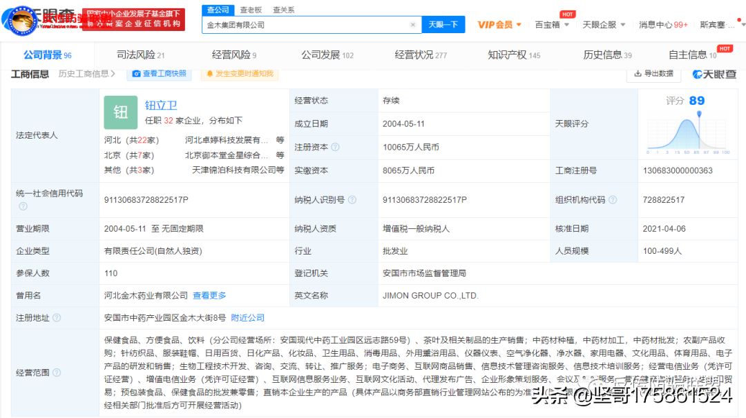 图片来源:天眼查 据天眼查显示,金木集团有限公司成立于2004年5月11日,位于安国市中药产业园区金木大街8号,注册资本10065万,实缴8065万,法人代表钮立卫是最大股东,持股100%。