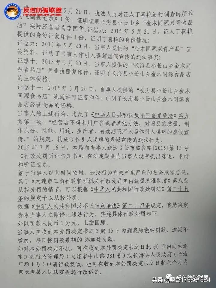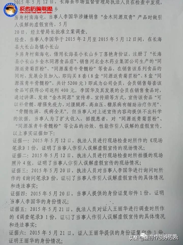 图片来源:反传防骗联盟据知情人士提供 据该裁判文书显示,2015年2月至2015年5月12日期间,长海县的李某借用丁某的身份证注册了长海县小长山乡金木同源食品店,销售河北金木药业集团公司生产的同源返青菊苣粉等食品,在销售该系列食品的同时,发展会员加入,即购买8套(8盒同源返青菊苣粉、8盒同源葆青牛骨髓粉,共计5200元)即成为公司会员,会员销售每套该食品可获利公司返利400元。李某及其发展的会员在销售食品时,通过讲课、发放金木同源宣传单 、宣传册等方式,宣传该食品可以补骨髓、增强免疫力,对腰腿疼、高血压、糖尿病有辅助治疗作用、骨髓饱满、疾病全无。但对上述宣传内容均提供不出科学的依据。李某为了扩大收入,招揽患者,对同源返青菊苣粉、同源葆青牛骨髓粉等食品的功效、性能作引人误解的虚假宣传。 李某的行为违反了中华人民共和国反不正当竞争法第九条第一款:经营者不得利用广告或者其他方法,对商品的质量、制作成分、性能、用途、生产者、有效期限产地等作引人误解的虚假宣传。的规定,构成了作引人误解的虚假宣传的违法行为。 鉴于李某经营时间较短,违法行为尚未产生严重的社会危害后果,属于大连市工商行政管理机关行政处罚自由裁量基准制度第八条从轻处罚的情节,可以根据中华人民共和同行政处罚法第二十七条的规定予以从轻处罚。 依据中华人民共和国反不正当竞争法第二十四条规定,大连市工商管理局责令当事人立即停止违法行为,实施具体行政处罚如下: 处以罚款人民币1万元,上缴国库。 据相关资料显示,金木药业集团是一家集中成药、中药饮片、药用冰片、保健食品生产及餐饮、宾馆为一体的综合性民营企业集团,公司的主要直销产品双青胶囊,成立于1993年,于2015年10月8日向国家商务部申领了直销牌照,并开始向社会吸纳直销会员,会员所在地覆盖了国内大部分地区。