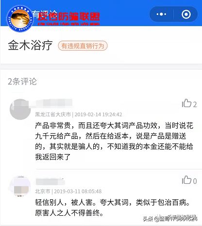 图片来源:商务部直销行业管理官网 据商务部直销行业管理官网显示,金木集团有限公司于2015年10月8日获得直销牌照,旗下共1个分支机构、10个服务网点,直销产品共4类23种。 经反传防骗联盟查询发现,金木集团涉嫌产品虚假宣传等违规行为已非个例,据相关媒体报道,金木集团近几年来一直处于虚假宣传、涉嫌传销、超范围运作市场的舆论漩涡中。 据公开资料显示,金木浴疗用以功能墨咱为主要成分作为母体,以自然水源为载体,通过外界温度场与人体温度场的交换作用,达到利用自然能量转换而对人体众多慢性疾病进行的自然保健疗法。