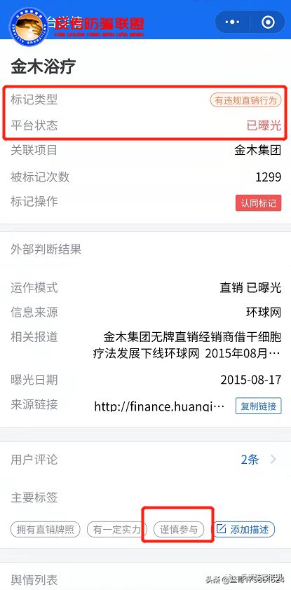 图片来源:灵鲲金融风险查询举报中心 据灵鲲金融风险查询举报中心显示,金木浴疗的标记类型为有违规直销行为平台状态为已曝光,曝光日期为2015年8月,被标记次数达1299次,同时其主要标签显示有谨慎参与的字样。用户评论区仅有的2条评论也均为差评。 结语
