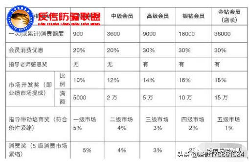 金木集团的奖金制度 一、市唱拓津贴10% 初级会员推荐只是58元,中高级推荐是10%。 中级和高级会员:推荐的初、中、高级分别是58,174,464元。 二、市场增长津贴:也叫碰对奖金。 每个人都运作两个部门,580PV为一单累计单数。按2:1碰对,也就是在大的部门里叁(以580为一个单位),小部门取一,为一碰。一碰奖金为,初级会员时50元,中级会员是 80元, 高级会员是100元。 比如,你大部门有58000PV,那就是有100个580,就是叫有100单,小部门有5800PV,就是有10单,这样,在小部门可以取十,大部门叁十,这 就是十碰,而大部门就还剩下八十单继续累积。中级会员奖金为10*80=800元,高级会员奖金为10*100=1000元。(级别不一样,同样的业绩, 收入是不一样的。) 注:安全局为50局,也就是每周50局以内,碰对为100元一碰,超过50局,按当周市场加权平均来计算K值,以保证制度的稳定。 三、市场领导津贴:也叫代数资金。 条件一、直接推荐1-2人,拿1代收入的10%; 直接推荐3-4人,拿2代收入的10%; 直接推荐5人以上,拿3代收入的10%。条件二、一代没有任何限制。 一周三碰,拿2代收入的10%; 一周五碰,拿3代收入的10%。 你推荐的人是你的第一代,也就是所有三代以内的人产生的碰对奖,公司都会给你提10%,这三代以内可能有十,也可能是几十人,只要产生碰对,公司就会发放这项津贴。 四、福利奖津贴。 所有符合资格的会员按照市场增长金额累计: 绩优开拓奖:满2万奖励笔记本电脑一台(考核期6个月) 绩优奋进奖:满10万元奖励价值5万元轿车一部(考核期18个月) 绩优挑战奖:满20万元奖励价值10万元轿车一部(考核期18个月) 其中绩优奋进奖与绩优挑战奖两种奖项不可兼得,只能二选一。 五、店补: 高级会员3万元可以向公司申请开店,公司按产品全额的6%给予店补。 从以上奖金构成可以看出,金木集团的经营是以人际传播为途径,以团队计酬模式进行的经营,且网络层级超过三层,属于典型的传销模式。据金木老会员反映,在2015年金木未领到直销牌照以前,该集团进行的是太阳线运营模式,即为老鼠仓式模式,是明显的传销运营模式。