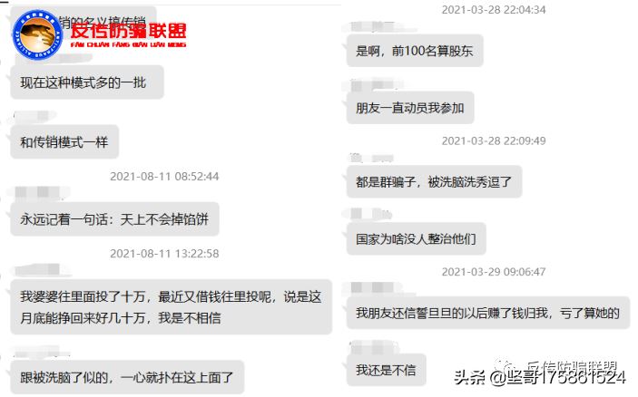 图片来源:金木集团维权群 除了产品虚假宣传,据金木集团维权群内的投诉人透露还涉嫌兜售原始股,而拉人头式的运营模式也被投诉人称其像极了传销。 据一位金木集团的投诉人透露,金木集团目前正在公开对外兜售原始股,前100名为股东,甚至有经销商在发展代理时承诺以后赚了钱归你,亏了算我的。而另一位维权人则称自己的家人已经在金木集团投资了十万,最近又在借钱投资,称月底就能挣回来好几十万。 据维权人透露,金木集团在其招商培训会议中均对外宣称其产品不仅能治百病还能挣钱,那么,这款值得投资的好产品为何会被投诉人一致认为其运营模式疑似传销呢?