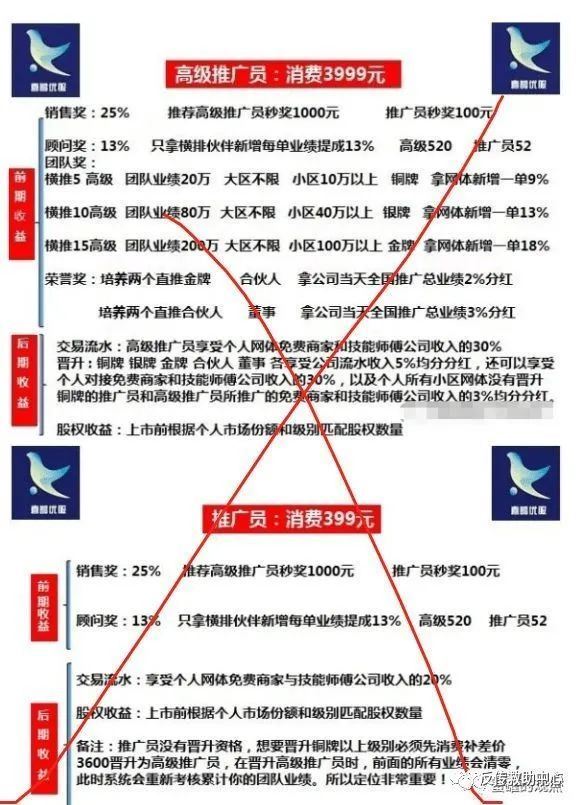 优人帮传销改名换姓喜鹊优服 加入平台需要门槛费用,那就是消费399和3999成为喜鹊优服合伙人推广员。 所谓的平台线下服务只是个幌子,而平台真正要做的,就是拉人消费,从而赚取推广奖金,具体奖金制度如下,这不就是纯纯的传销骗局吗?