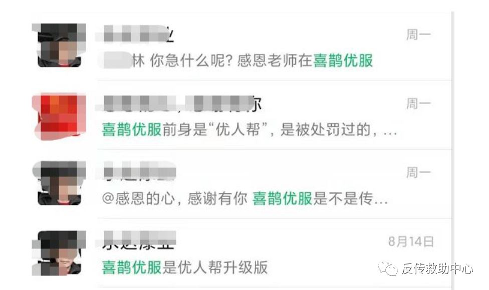 今年初,优人帮因被查关闭了,也是一个虚假的服务平台,暗地里干的是传销的勾当。 之前优人帮已经有一批人被骗了,后来操盘手无奈,只能破罐子破摔,继续包装,搞出了喜鹊优服。 通过调查,也从侧面发现了蛛丝马迹,某喜鹊优服推广人的自媒体以前就是推广优人帮的,而且在此之前还有很多项目名称,可见此人也是个惯犯。