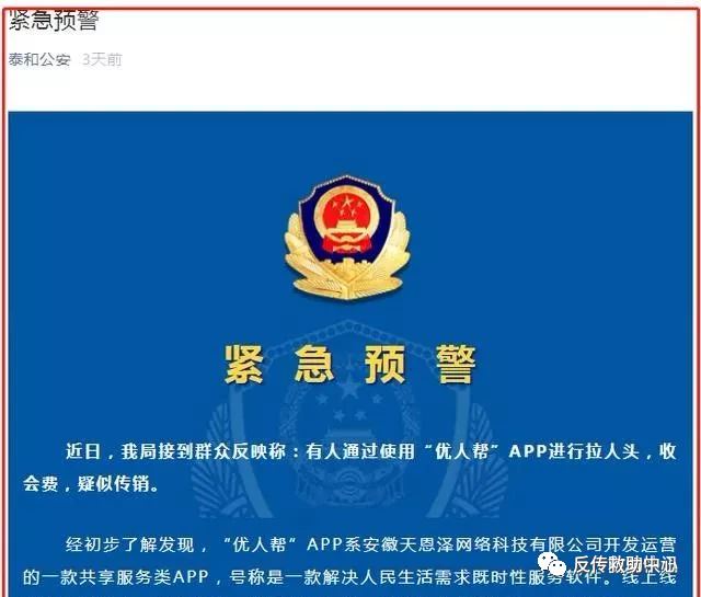 近日,刘李冰反传销团队讯:知情人向我们反应安徽恩泽网络的优人帮APP涉嫌传销被查以后,遭遇杭州法院裁定冻结800万存款,之后为了躲避打击,改名换姓喜鹊优服继续从事传销活动骗人。 公安局紧急预警优人帮APP涉嫌传销 近日,我局接到群众反映称:有人通过使用优人帮APP进行拉人头,收会费,疑似传销。