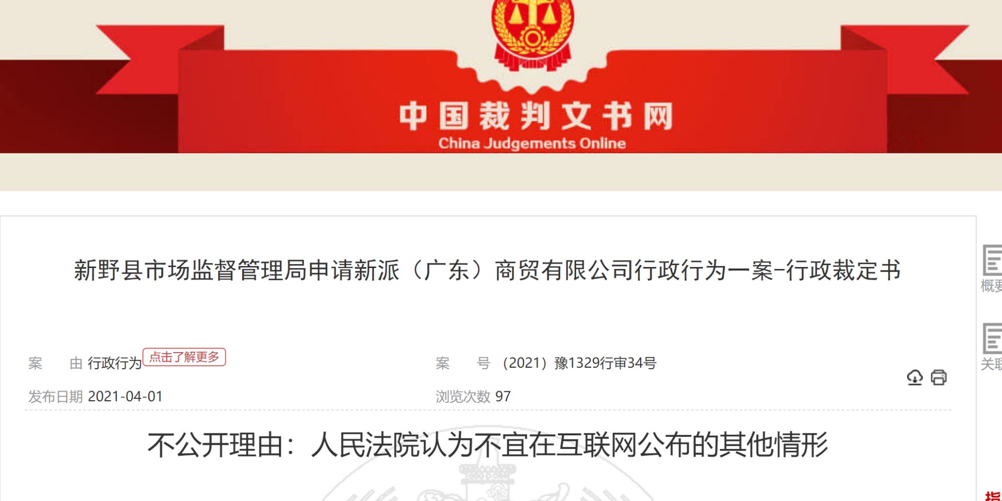 值得注意的是,今年4月1日,中国裁判文书网公布一则题为新野县市场监督管理局申请新派(广东)商贸有限公司行政行为一案-行政裁定书(简称:行政裁定书)。但该行政裁定书并未公开详细内容。