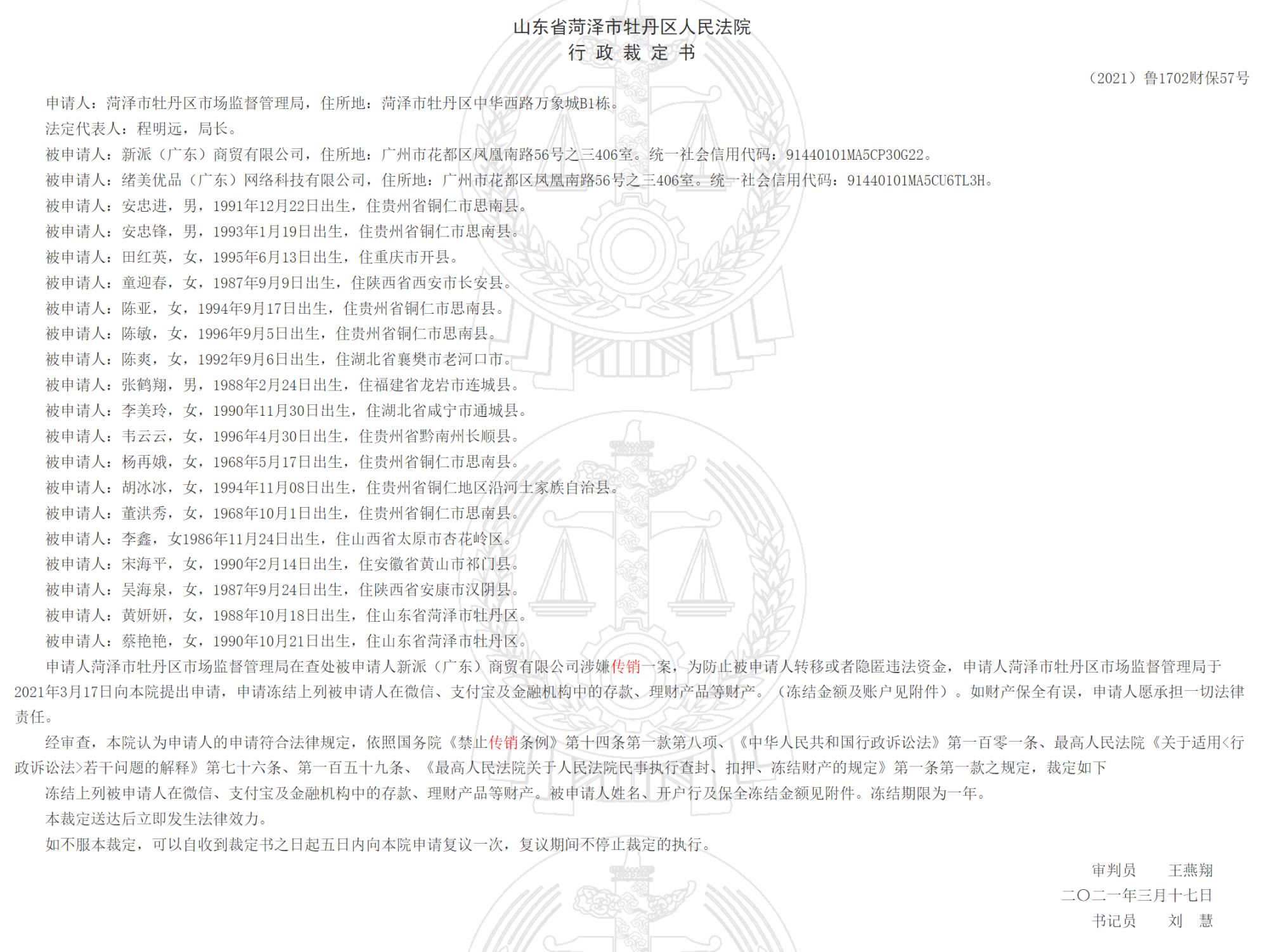 据该行政裁定书显示,申请人菏泽市牡丹区市场监督管理局在查处被申请人新派(广东)商贸有限公司涉嫌传销一案,为防止被申请人转移或者隐匿违法资金,申请人菏泽市牡丹区市场监督管理局于2021年3月17日向本院提出申请,申请冻结上列被申请人在微信、支付宝及金融机构中的存款、理财产品等财产。(冻结金额及账户见附件)。如财产保全有误,申请人愿承担一切法律责任。 经审查,本院认为申请人的申请符合法律规定,依照国务院禁止传销条例第十四条第一款第八项、中华人民共和国行政诉讼法第一百零一条、最高人民法院关于适用<行政诉讼法>若干问题的解释第七十六条、第一百五十九条、最高人民法院关于人民法院民事执行查封、扣押、冻结财产的规定第一条第一款之规定,裁定如下: 冻结上列被申请人在微信、支付宝及金融机构中的存款、理财产品等财产。被申请人姓名、开户行及保全冻结金额见附件。冻结期限为一年。 本裁定送达后立即发生法律效力。如不服本裁定,可以自收到裁定书之日起五日内向本院申请复议一次,复议期间不停止裁定的执行。 据天眼查APP显示,新派(广东)商贸有限公司成立于2019年4月8日,实缴资本为1000万元,安忠进担任法人。