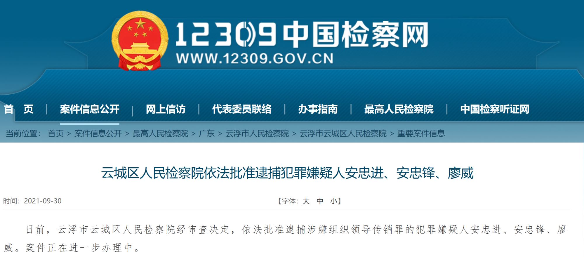 近日,北青网降在12309中国检察网发现一则题为云城区人民检察院依法批准逮捕犯罪嫌疑人安忠进、安忠锋、廖威信息,该信息显示,日前,云浮市云城区人民检察院经审查决定,依法批准逮捕涉嫌组织领导传销罪的犯罪嫌疑人安忠进、安忠锋、廖威。案件正在进一步办理中。 经查,安忠进、安忠锋、廖威三人则是新派商城的核心负责人,运营公司为新派(广东)商贸有限公司。 今年4月,中国裁判文书网公布一则题为菏泽市牡丹区市场监督管理局、新派(广东)商贸有限公司行政监察(监察)其他行政裁定书(以下简称:行政裁定书)。
