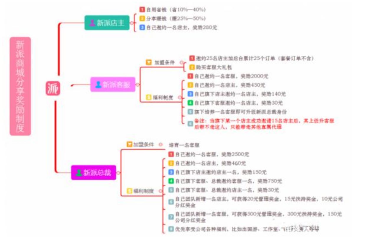 那么,新派(广东)商贸有限公司为何会因涉嫌传销而被冻结账户呢?据相关媒体报道,与该公司推出的新派商城有关。据悉,新派商城将会员设置店主、客服、总裁等多个层级,通过不同的门槛费用区分不同级别,并设立相应的奖励制度:店主直推店主奖励360元;客服直推店主奖励450元;总裁直推店主奖励460元。客服直推客服奖励2000 元;总裁直推客服奖励2500元。 此外还有额外的分红奖励。为了赚回会费或者获利,缴费会员只有继续拉新人加入才可行。拉一个新会员,新派会给予360元的奖励,以此来刺激会员拉人头。据相关人士透露:新派商城的前身即是广州姿薇雅生物科技有限公司,该公司最初是销售‘绪美’品牌的化妆品,新派商城600元加入会员所赠送的也正是这款产品。 如今,从跑路再到被捕,真可谓是法网恢恢,疏而不漏,任何涉嫌传销的平台很难逃过法律的制裁。 |